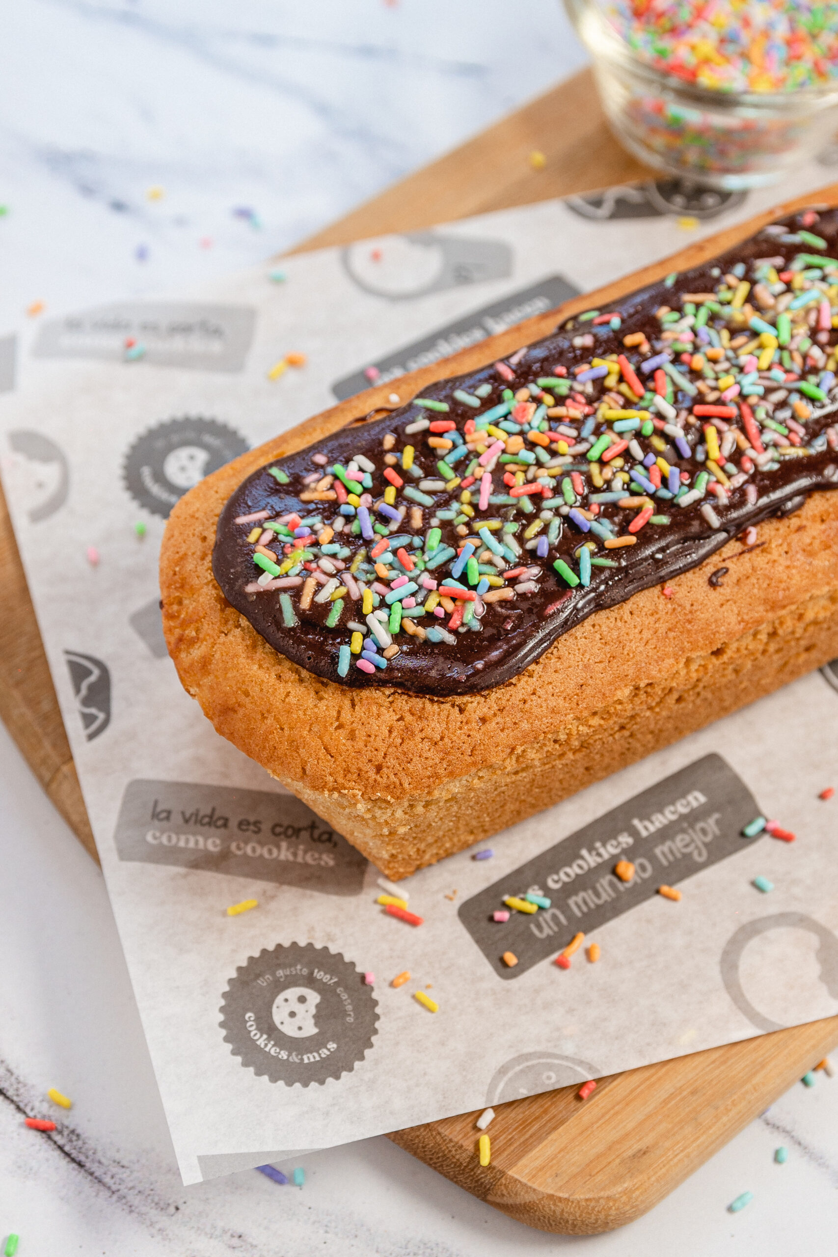 Delicioso, esponjoso, sin conservantes y pronto para sacarse del freezer y consumirse cuando gusten, budín de vainilla con chocolate y granas de colores!